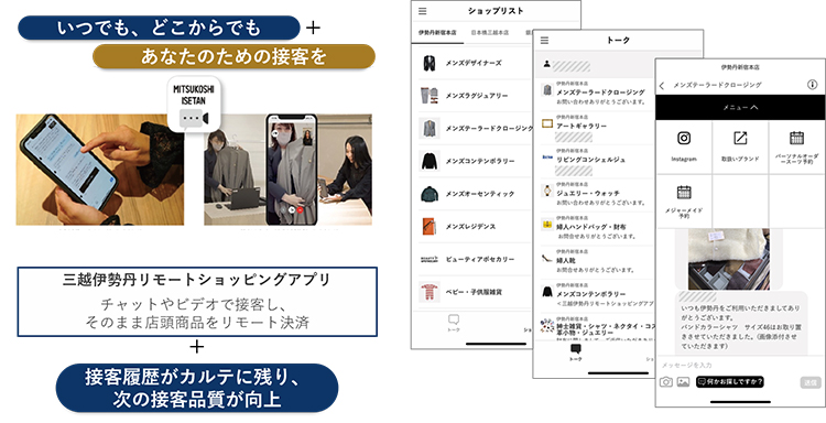 「三越伊勢丹リモートショッピングアプリ」では、どこにいても、百貨店の販売員とチャットで会話したり、ビデオ接客を受けたりしながら、買い物を楽しむことができる。