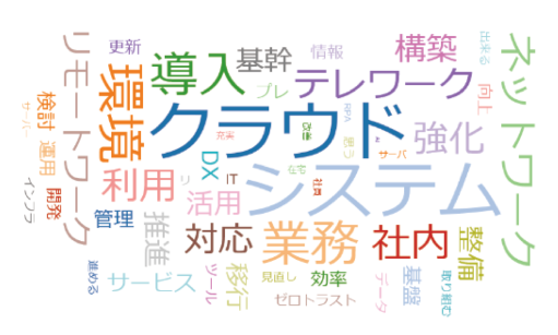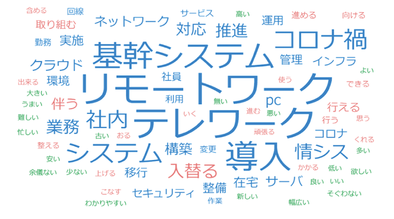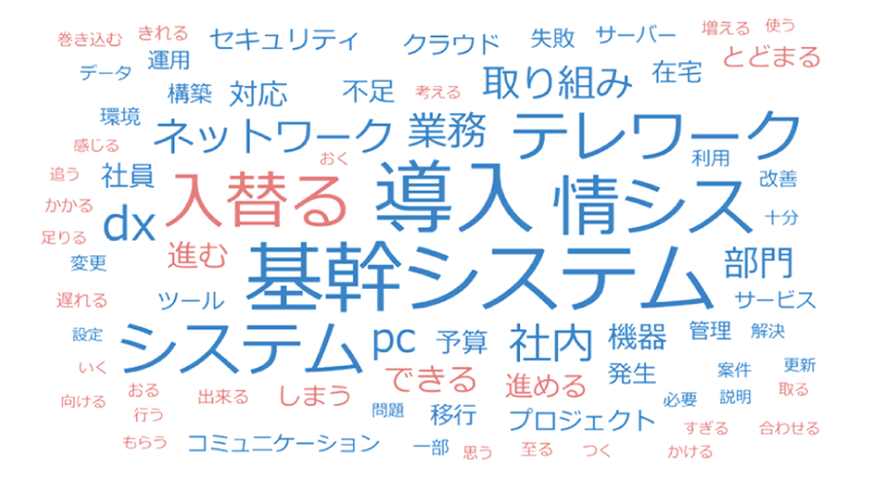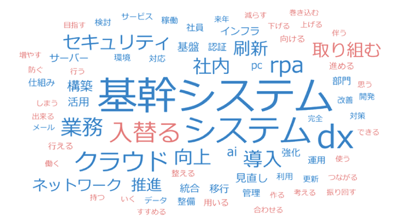 基幹システム関連ではシステムの刷新やリプレース、DX・デジタル化関連では DX 推進や具現化などに関するコメントが多く寄せられました。