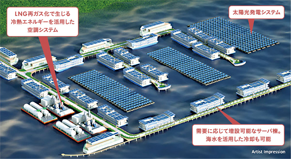 また、イノベーションという観点では、同国大手DC事業者であるケッペルDCが2018年に発表した海上に浮かぶフローティングDC計画*3は、DCの用地不足を補い、エネルギー消費効率を上げ、冷却に必要な処理水を削減できるアイデアと言えるでしょう(以下の図参照)。