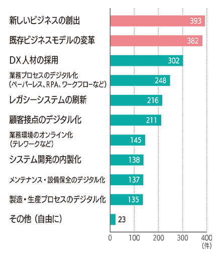 ① 新しいビジネスモデルの創出 ② 既存ビジネスモデルの変革 ③ 顧客接点のデジタル化 ④ DX 人材の採用 ⑤ システム開発の内製化