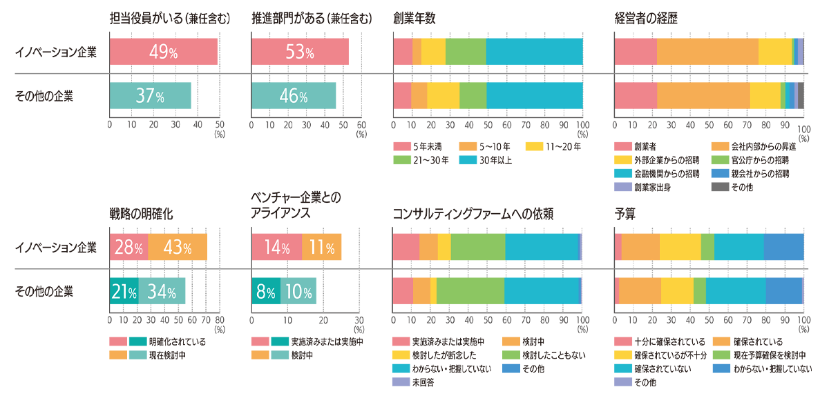 イノベーション的 DX 実現には、担当役員・部署の設置、戦略の明確化、ベンチャー企業とのアライアンスなどを通して、既存業務プロセスのデジタル化や業務環境のオンライン化がポイントとなることがうかがえる。一方、経営者の経歴、予算の有無、創業年数、コンサルティングファームへの依頼に関する設問では、結果的に大きな差は出なかった。