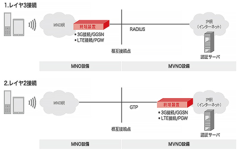 レイヤ3接続は、事業者間の相互接続点におけるプロトコルとしてRADIUSを使用する接続方法で、MVNOは認証サーバのみを用意する。一方、レイヤ2接続は、事業者間の相互接続点におけるプロトコルとして、GTP(GPRS Tunneling Protocol)を使用する接続方法。レイヤ2接続のMVNOは、PGW(Packet Data Network Gateway)と呼ばれるGTPの終端装置がMVNO側に存在し、携帯電話のネットワーク機能の一部を直接的にコントロールできるため、サービスの自由度がレイヤ3接続に比べて高い。特に、お客さまの通信に対し、リアルタイムに通信量を把握し、通信速度を制御できるのは、レイヤ2接続のみの特徴。