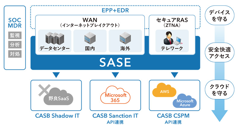 こうした課題に対する解決策の1つに、米ガートナー社が2019年に提唱した新しいネットワークセキュリティモデル「SASE(Secure Access Service Edge)」の活用が挙げられます。