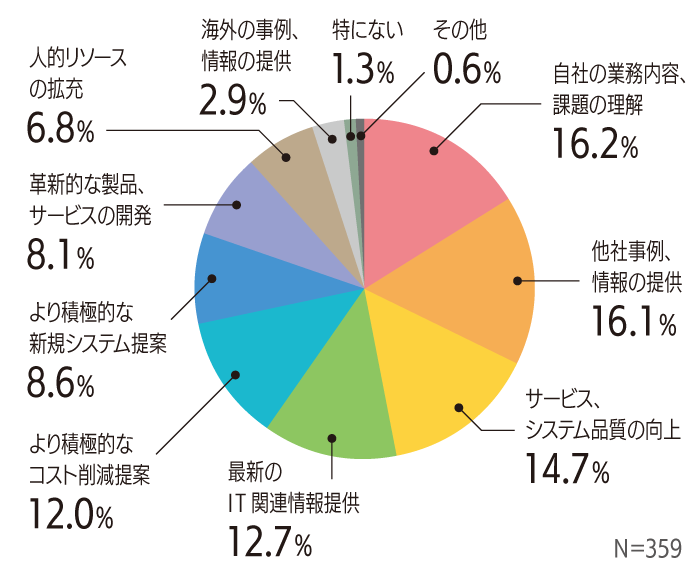 「自社業務の理解」を筆頭に同等のパーセンテージの回答が複数存在し、ITベンダへの要望が多岐にわたることが読み取れる。