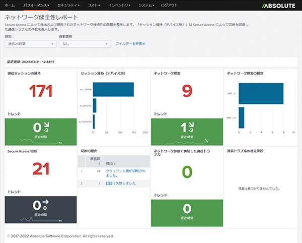 このダッシュボードでは、まずネットワークの「健全性」を確認します。今、ネットワークで障害は起きているのか、起きているのであれば、その状況は以前と比べて増えているのか、減っているのか……といったことを把握します。