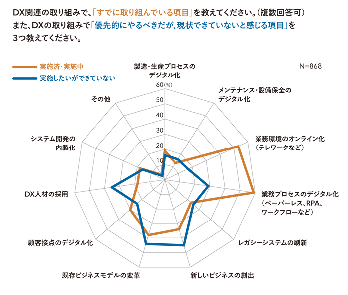 これらの結果から、情シスの方々の業務が、デジタル化やDXといった分野に関わるなかで、業務プロセスのデジタル化は進められているものの、新規ビジネスの創出やビジネスモデルの変革はあまりできておらず、システム開発の内製化およびDXに必要な「クラウド上でソフトウェアを開発できる人材」や「最適な情報システムを構想し、実装できるアーキテクトといったクラウドネイティブな人材の採用」といった部分において課題を抱えていることがわかってきました。