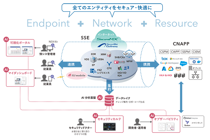 セキュリティは、これまでDWPで提供してきたデバイスやネットワークのゼロトラストセキュリティ(ZTNA)に加え、クラウドリソースを守るセキュリティ機能であるCNAPP(Cloud Native Application Protection Platform)をシームレスに連携・提供していきます。さらに、今まで「IIJ C-SOCサービス」として提供してきた脅威の検知・対応といった機能を拡大し、脅威の特定・防御・検知・対応・復旧など、NISTのCyber Security Frameworkで定義されている全ての領域に対応します。