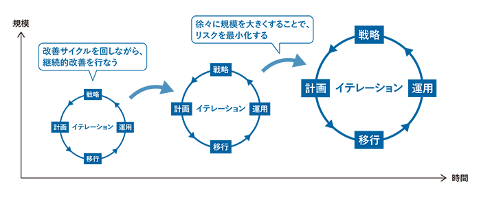 以上のような「ガードレール」として提供する機能群を効果的に使いながら、お客さまの業務に寄り添い、DXを「攻め」と「守り」の両面から推進していくためのコンサルティング、SIを提供していきます。DXを効果的に実現するには、クラウド化のライフサイクルを継続的に回していく必要があり、そのために従来のような1回で完了させるウォーターフォール型の移行プロジェクトだけでなく、小さく始めて少しずつ規模を大きくしていくようなアジャイル型のスタイルも取り入れていきます。(図5)