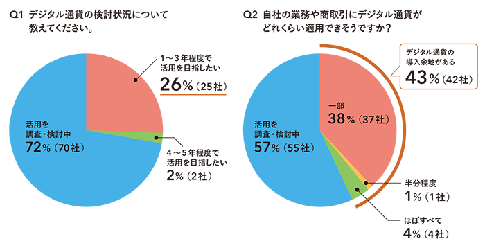 また、我々が昨年行なったデジタル通貨の意識調査アンケートでは、26パーセントの企業がデジタル通貨について1〜3年以内の活用を目指したい、43パーセントが自社の現状の業務・商取引に適用できそうだ、と回答しており、想像以上にデジタル通貨の導入に対する関心が高いことがわかりました。