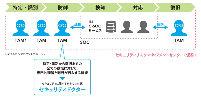 お客さまの業態やITシステムの特性・重要性を理解したセキュリティ担当が、かかりつけ医のように寄り添いつつ、総合病院のような高度な知見や技術でもってセキュリティリスクへの対応の実務を支援するのです。我々が目指すのは、セキュリティ領域のドクター=セキュリティテクニカルアカウントマネージャ(以下、セキュリティTAM)です。