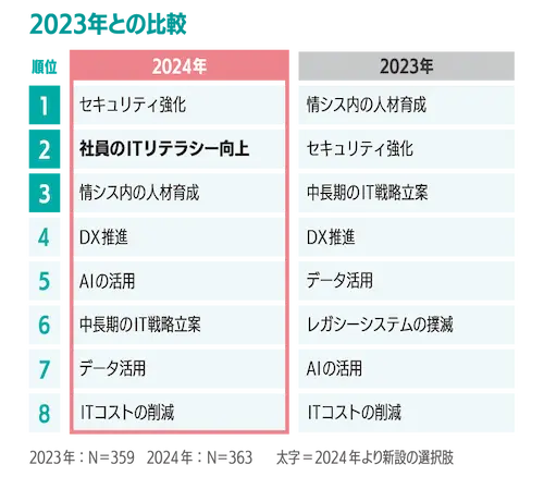 今後、強化すべきことの1位は「セキュリティ」(昨年は2位)。2023年に登場した「DX推進」は今年も同じ4位、2023年に7位だった「AIの活用」は5位となった。2024年に新設した「社員のITリテラシー向上」が2位にランクインする一方、「レガシーシステムの撲滅」は順位を下げた。