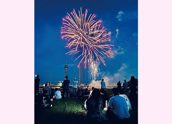 デュッセルドルフは「ファッションとアートの都」として知られ、洗練された街並みと落ち着いた雰囲気が魅力的です。ライン川沿いのプロムナードでは、ジョギングを楽しむ人々やカフェでくつろぐ地元の方々が織りなす穏やかな日常が広がっています。また、欧州有数の日本人コミュニティが存在し、毎年5月末に開催される「ジャパンデー」には各国から60万人もの参加者が訪れ、日本文化を紹介する大規模なイベントとして賑わいます。茶道や武道といった伝統文化のデモンストレーション、夜空を彩る壮麗な花火大会は、地元住民との交流を深める特別な機会となっています。