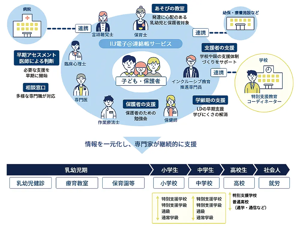 ICTを活用して情報共有を図ることで、複数の専門職による対応、個々の子どもに応じた迅速な支援体制づくり、学習障がいの早期発見、保護者との情報共有、さらにはライフステージや支援者の交替に際したスムーズな引き継ぎなどを可能にし、乳幼児期から高校卒業まで切れ目なく支援することを目指しています。
