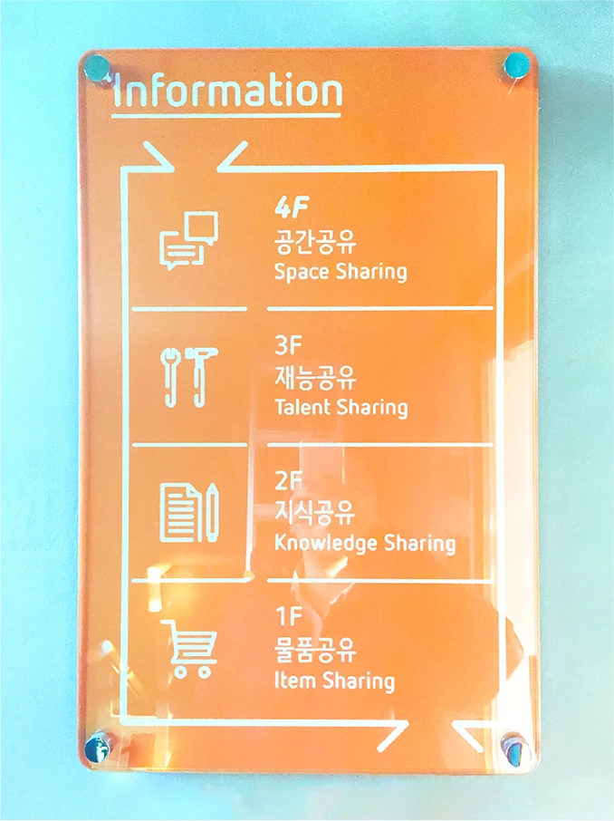 当初はさまざまな企業を支援し、包括的なエコシステムを作ることで遊休資源の活用促進などに重点を置いていた。具体例として民間事業を市が束ねてブランド化したカーシェア事業がある。ソウル市自身も公用車を買い替える代わりに、カーシェアに市の駐車スペースを提供し、行政職員もカーシェアを使うようにした。シェア用の自動車は公共駐車場で割引を受けられるなどの特典がある。民間企業やマンションにも駐車場の一部をカーシェア用とすることを勧め、2020年には提供地域を市中心部から郊外へ拡大した。その他、公共施設の会議室の休日開放やモノの貸出し、公共資産の積極的なシェアリングや学生と高齢者を対象としたシェアハウス(住宅マッチング)などが知られている。