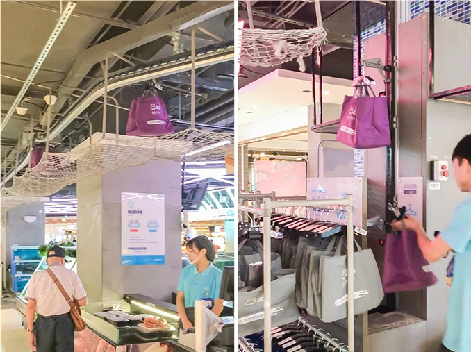 2.ネット注文された商品が天井のコンベアで運ばれる店内の様子