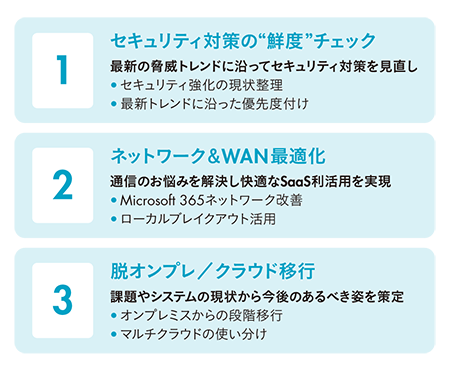 業務環境のクラウドシフトが進むなか、Microsoft 365の利用拡大やローカルブレイクアウトの活用など、ネットワーク領域での最適化は多くの企業にとって共通の課題です。ワークショップでは、現状のネットワーク構成をもとに、最適化の方向性を検討し、改善に向けた具体的な方策を探ります。