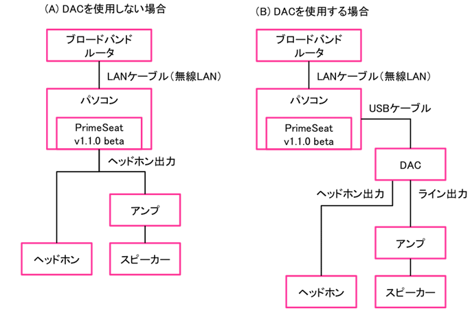 DSDの音源を再生するには、PC(Windows/Mac)と専用ソフトウェア「PrimeSeat v1.1.0 beta」、および対応DACが必要となります。DACがない場合は、端末機器の再生能力に応じた音質に自動コンバートして再生されます。