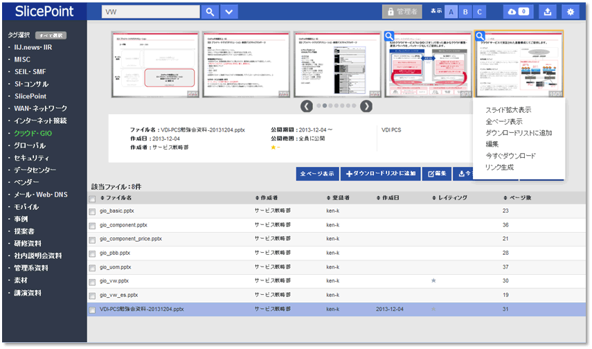 株式会社インターネットイニシアティブ(IIJ、本社:東京都千代田区、代表取締役社長:勝 栄二郎、コード番号:3774 東証第一部)は、PDFやPowerPointなどのドキュメントを全文検索し、オンラインプレビューで確認、ダウンロードできるソフトウェア「SlicePoint(スライス・ポイント)
