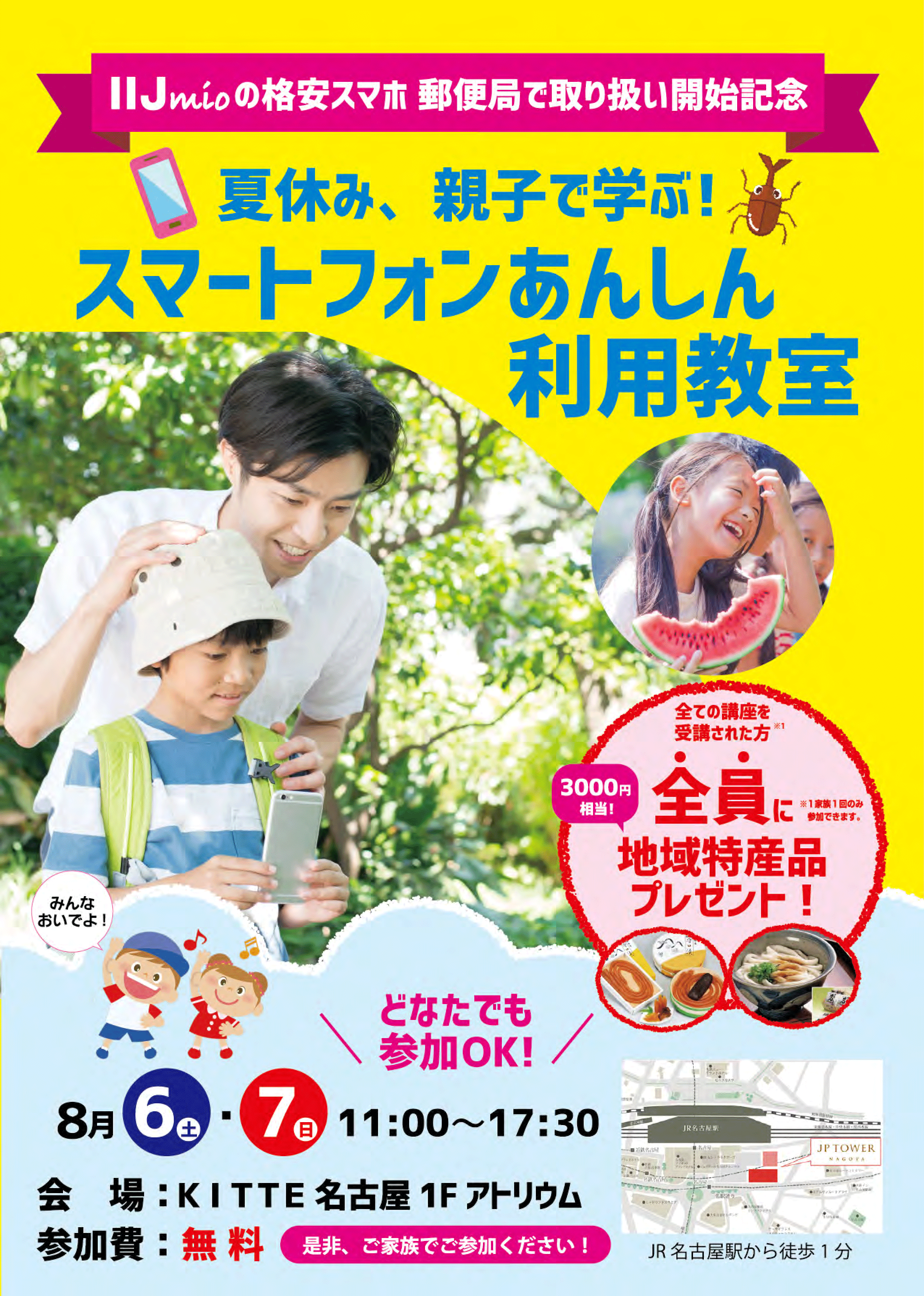 株式会社インターネットイニシアティブ(本社:東京都千代田区、代表取締役社長:勝 栄二郎、コード番号:3774 東証第一部、以下IIJ)は、来る8月6日(土)~7日(日)に、親子向け夏休みイベントとして、「スマートフォンあんしん利用教室」をKITTE名古屋で開催します。