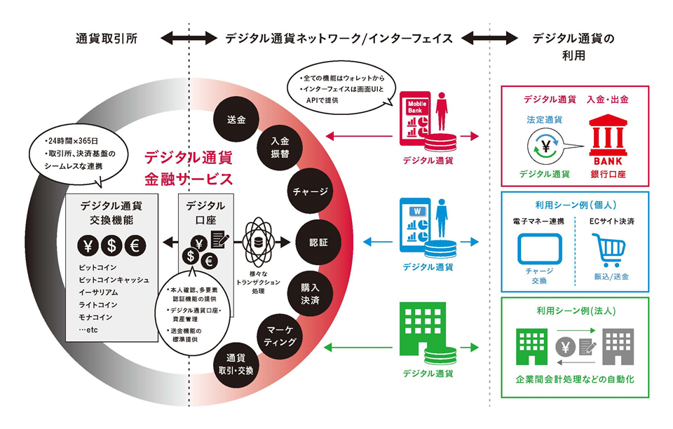 これらのサービスは、①多数のデジタル通貨を管理できる口座機能、②適正な価格でいつでも交換できる取引所機能、③デジタル通貨の発行事業者や決済サービスを利用するECサイト・実店舗などを連携するネットワーク機能およびAPI(※4)を有するシステムにより、実現いたします。