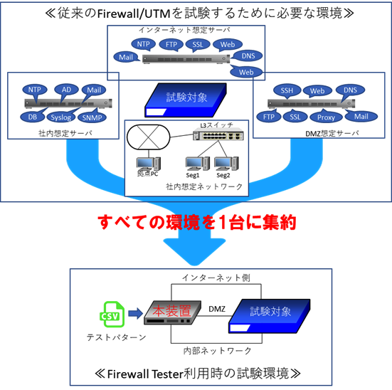 一般的にFirewall/UTM機器設置の際に必要となるセキュリティポリシーの試験は、実際のネットワーク環境と同等の評価環境を構築し設計通りにポリシーが動作しているかの検証を行いますが、それら評価環境構築に係る多大な工数の発生、試験を実施できる一部のSEへの負荷集中という課題がありました。