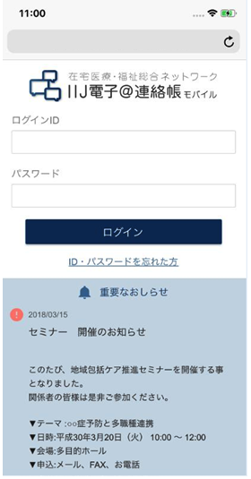 株式会社インターネットイニシアティブ(IIJ、本社:東京都千代田区、代表取締役社長:勝 栄二郎、コード番号:3774 東証第一部)は、医師や看護師、介護士、薬剤師など在宅医療に関わる様々な専門職の方が医療・介護情報を共有するためのプラットフォーム「IIJ電子@連絡帳サービス」において、タブレットやスマートフォンに特化したモバイル版を本日より提供開始いたします。
