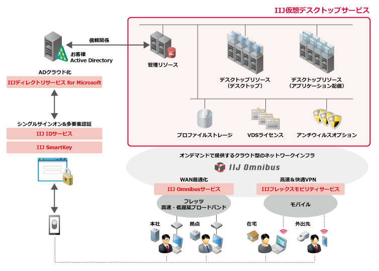 Active Directory(AD)のクラウド運用サービス「IIJディレクトリサービス for Microsoft」や、クラウド型ID管理・認証サービス「IIJ IDサービス」を併せてお使いいただくことで、ADサーバのインフラ運用やID・パスワード管理の負荷軽減、フェデレーション(各種サービスへのシングルサインオン)が実現できます。ワンタイムパスワードの管理アプリ「IIJ SmartKey」で段階認証によるセキュリティ強化も図れます。