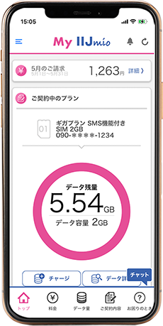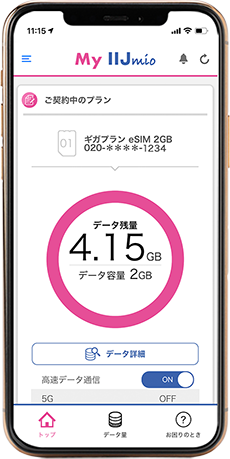 本アプリでは、データ利用状況の確認や契約内容の照会など特にお客様からご要望の多かった機能を提供しており、お客様はギガプランをより便利にお使いいただけるようになります。また、同一mioIDで複数回線ご契約されている場合、契約者と利用者で確認できる画面を変えられます。例えば利用者がお子様だった場合、サービス内容の変更やデータ量の購入など、契約内容に関する情報を表示しませんので誤操作の心配がありません。なお、5Gオプションを含むオプションの追加やデータシェアの設定など各種変更手続きについては、アプリ画面からリンクされたIIJmio会員専用ページに遷移し、Webサイト上でお手続きいただけます。