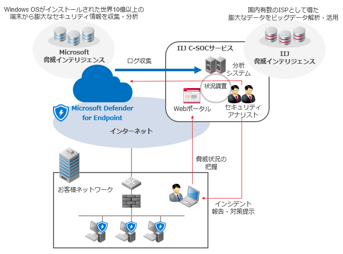 当社は、セキュリティオペレーションセンター(SOC)でお客様システムのログ監視やインシデント対応を行う「IIJ C-SOCサービス」において、Microsoft 365 製品との連携、監視、分析および対応機能を開発し、第一弾としてEDR(※)機能を持つMicrosoft社のエンドポイントセキュリティ製品「Microsoft Defender for Endpoint(MDE)」のセキュリティ運用を、本日より提供開始いたします。