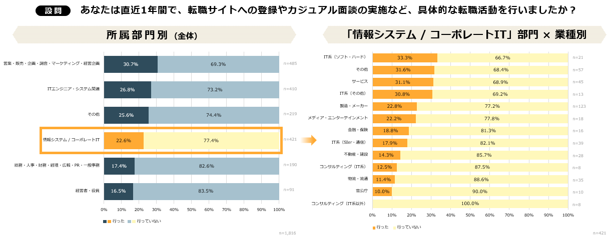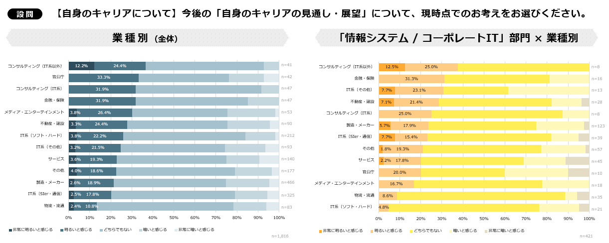 また、転職活動状況を尋ねる質問では、情報システム/コーポレートIT部門で働く人の約23%が直近1年間で転職活動を行ったと答え、業種別で見ると「IT系(ソフト・ハード)」が約33%と最も高い数値でした。「IT系(ソフト・ハード)」は今後のキャリアの見通しが明るいと答えた割合が最も低い業種でもありました。