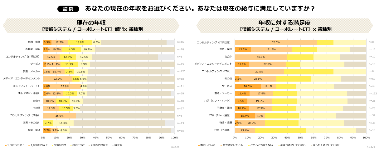 情報システム/コーポレートIT部門で働く人のうち、今後の自身のキャリアの見通しが明るいと答えた割合、および現在の年収に満足していると答えた割合を業種別に見ると、「コンサルティング(IT系以外)」が最も高く、「金融・保険」が続く結果となりました。