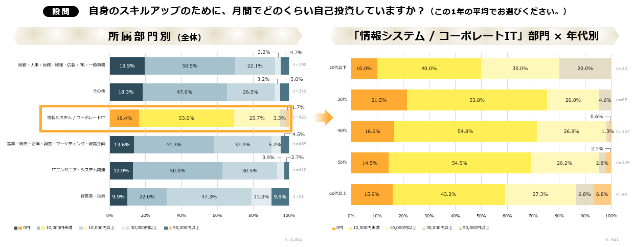 さらに、自身のキャリアやスキルの向上に対する姿勢を見てみると、情報システム/コーポレートIT部門の約31%がスキルアップのために月間で1万円以上の自己投資をしており、年代別で見ると20代以下が何かしら自己投資をしている人の割合が最も高い、という結果となりました。今後キャリアのために取り組みたいと考えていることとして「資格取得」との回答が最も多く、ほかに勉強会やセミナーの参加、また副業という意見も目立ちました。