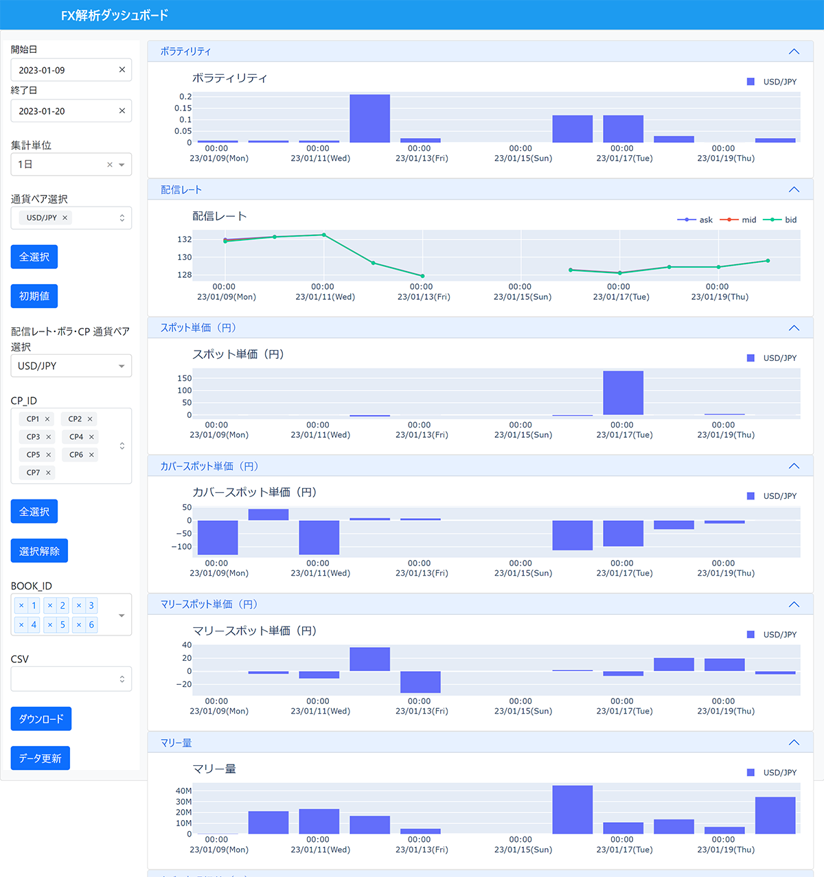 取引やディーリングにかかわるデータをリアルタイムで可視化し、ダッシュボードに表示します。