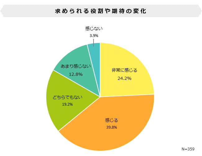 また、「経営や他部署が情シスに求める役割に変化を感じるか」という問いには、約6割が「感じる」と回答し、 企業におけるシステム部門への期待が変化してきていることがわかります。具体的な変化としては、DXやAIなどの新技術、セキュリティといったテーマへの対応依頼や相談が増えているとの声が多く、またそれらの推進役としての期待が高まっているという意見も見られました。