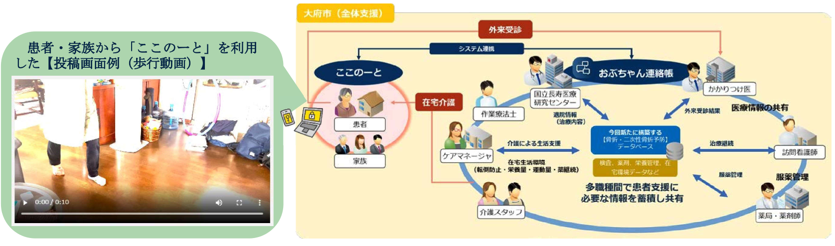 本取り組みは、運動機能の低下・加齢による筋肉量の低下により要介護予備軍となっている高齢者を対象に、「骨折・二次性骨折予防(FLS)(※1)」を行うためのプロジェクトです。大府市にある国立長寿医療研究センターが主体となり、市が運営する「電子@連絡帳」(通称:「おぶちゃん連絡帳」)を利用して、地域の医療介護関係者と情報連携のうえ実施いたします。具体的には、センターが持つ患者の退院情報・治療経過に関する情報を、「おぶちゃん連絡帳」を活用して地域の医療介護関係者と共有することで、今後の通院スケジュールやその経過、服薬継続、食事(栄養)、運動量に関して、それぞれが共通認識のもと、市民(患者)の健康データを管理し、継続してFLSを行います。