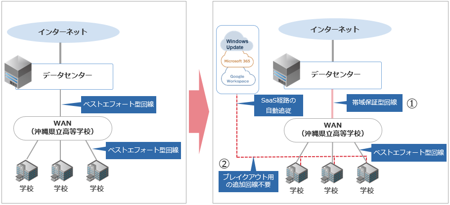 遅延原因の切り分けの結果から、各学校からの通信が集中して輻輳が起こりやすいデータセンター側の回線を、ベストエフォート型(※3)から帯域保証型に切り替えて、ボトルネックポイントを解消しました。