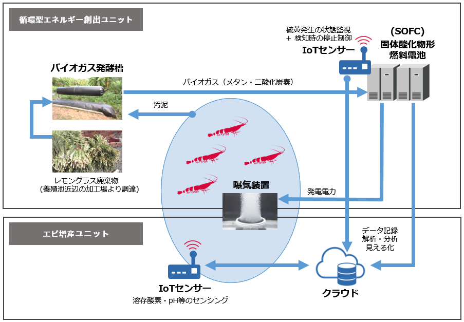 IoTによる「エビ増産ユニット」では、IoTデバイスを使い、溶存酸素濃度、pHなどをセンサーで計測するほか、IoTプラットフォームを設計、養殖池の水質データに加え、バイオガス発酵槽とSOFCの状態監視などを含むデータの保存、可視化を行い、データの閾値監視やアラート通知機能などのシステムを構築することで、養殖環境とエビの育成状況との相関性を分析します。エビにとって最適な養殖環境を見出し、養殖効率向上を目指します。