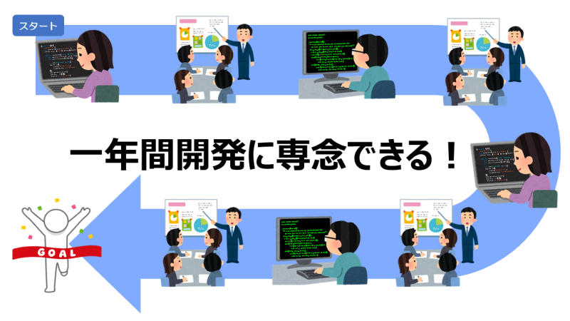 自分のやりたい開発テーマを提出し、審査を経て採択されれば、採択された開発に一年間専念できる社内公募プログラムです。