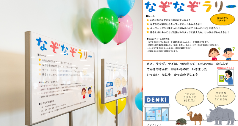 各階に設置されたなぞなぞにチャレンジするプログラムです。すべてのなぞなぞに正解し集まったキーワードをイベントスタッフに伝えるとノベルティがプレゼントされます!子供たちと一緒に悩みながらクイズに挑戦できるプログラムだったので、とても楽しめるプログラムとなりました。