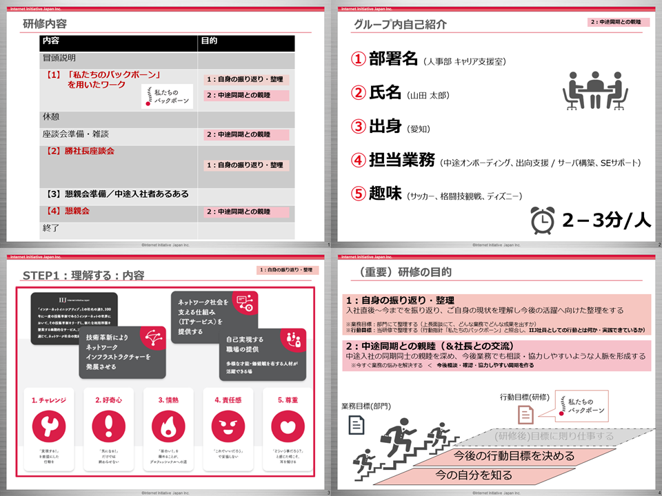 山中:これまでに入社した中途入社者の課題として、IIJという新しい環境で日々の仕事に一生懸命取り組む中、同期と呼べる人や部門外で気軽に話せる人がいないことや、自身のこれまでの仕事やキャリアについて振り返るタイミングが取りづらいなどの課題が見えていたため、これらを解決するべく、中途入社者フォローアップ研修というものを実施しています。