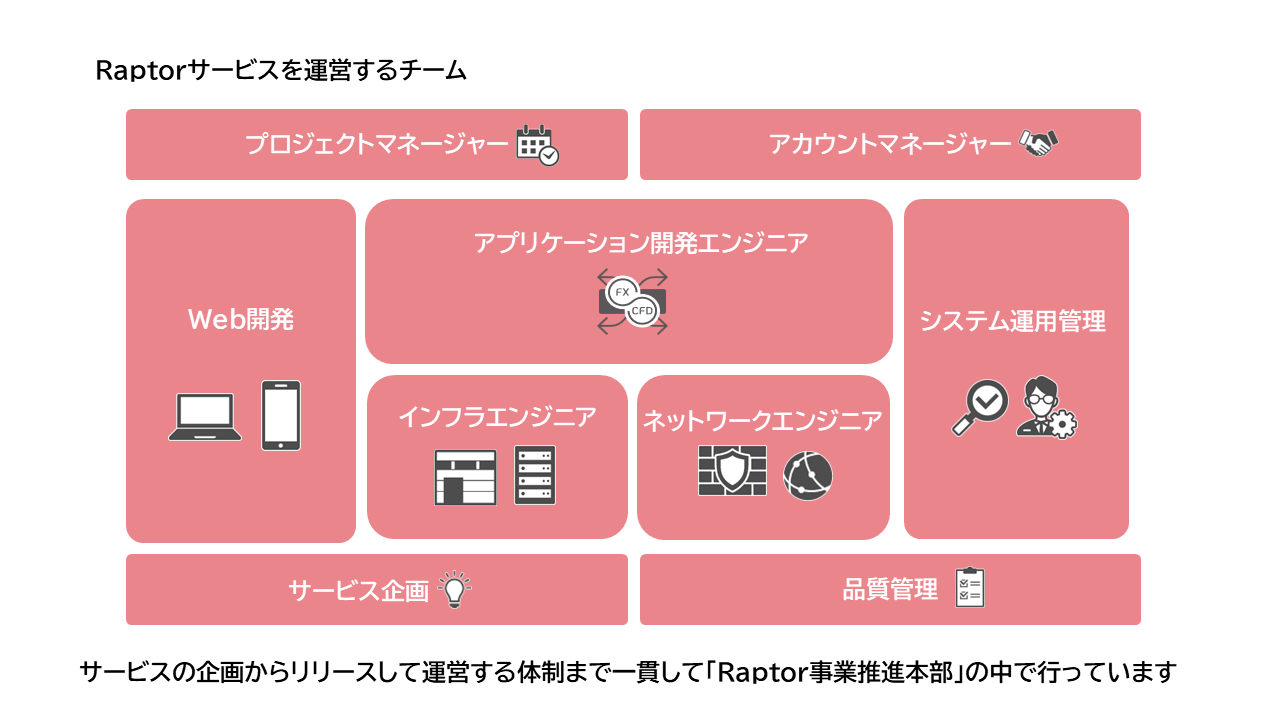Raptorサービスを運営するチームは、開発チームと運用チームに分かれており、Raptor事業推進本部内で企画からリリース、運用まで一貫して行っています。