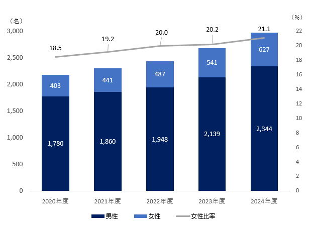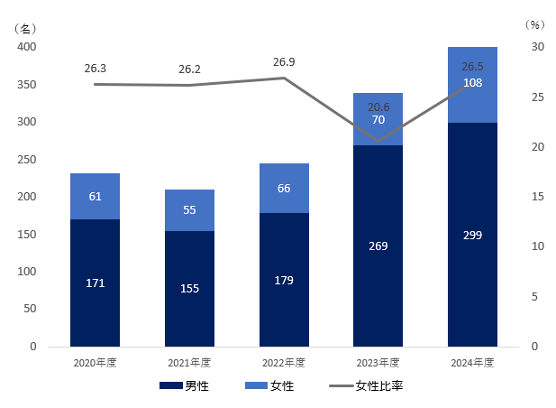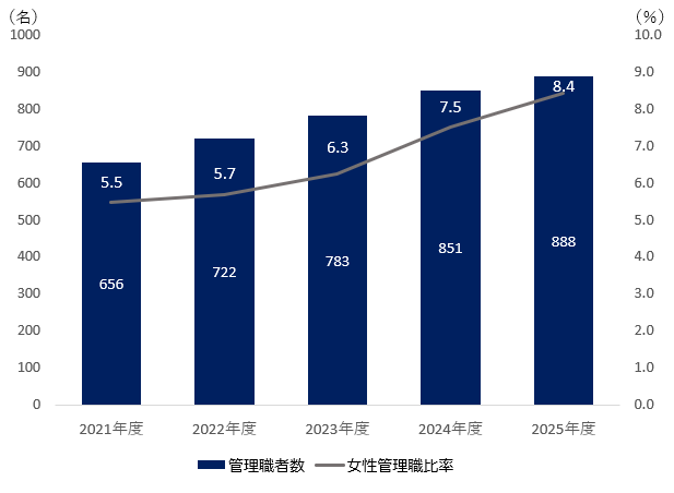 近年、当社の女性採用数(新卒・中途)、女性社員比率、女性管理職比率はいずれも増加しています。2025年4月現在、当社の女性管理職比率は8.4%となり、FY24及びFY27の目標をそれぞれ前倒しで達成いたしました。