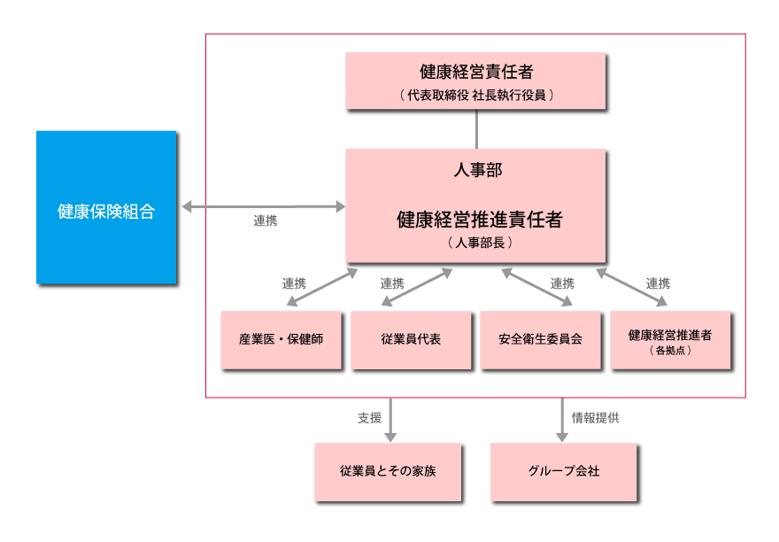 IIJでは、健康経営責任者を筆頭に、人事部が中心となり、産業医、保健師、従業員代表、安全衛生委員会、各拠点の健康経営推進者と連携しながら全社一体となって健康経営を推進しています。