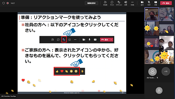 (最初にWeb会議ツールの使い方を練習しました。参加者はリアクションマークを押して、反応を楽しみます。)