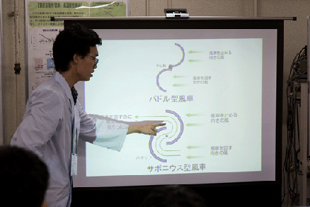 ニュースで見ることも多くなった「IoT」という言葉が意味するものと、それが実現すると何ができるのか?といったこと。そして、サボニウス型風車がどのような特徴を持つ風車で、どれぐらいの発電量が期待できるものなのか?といったこと。現場の第一線で活躍する若手エンジニアや大学院生の話は、流石にライブ感があります。
