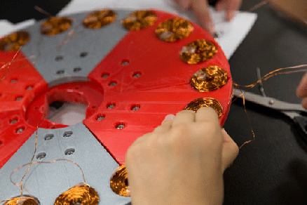さらに、コイルを止めているセロハンテープと磁石盤が擦れて抵抗となり、発電量が減っていることも問題です。そこで、写真のように銅線で盤とコイルをきつめに縛ることで問題を解決しようとしました。