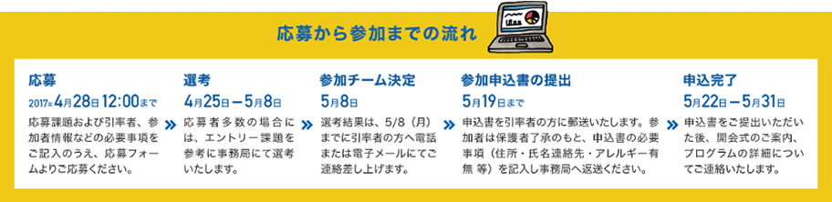 以下の応募条件にご承諾・同意いただける場合、エントリー課題および引率者、参加者情報などの必要事項をご記入のうえ、ご応募ください。応募フォームのご記入・登録は引率者の方にお願いいたします。