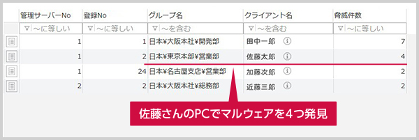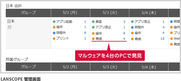 マルウェア検知前後の操作ログから、感染原因となるWebサイト閲覧・メール開封などの行動特定が可能です。