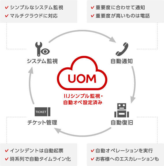 運用や監視サービスで面倒なのが、自社の環境に合わせた初期設定ですが、そんな面倒な作業は、IIJにお任せいただけます。長年の監視・運用実績を持つIIJが、オススメの監視・運用設定を実装済みの状態でご提供します。UOMにログインした瞬間から、効率的なシステム運用が実現します!