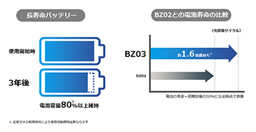 電池寿命をより長くする技術の搭載で、3年間注1使用しても劣化しにくい長持ちバッテリーを実現しました。arrows BZシリーズ史上最長注2の電池寿命で、安心して長く使えます。